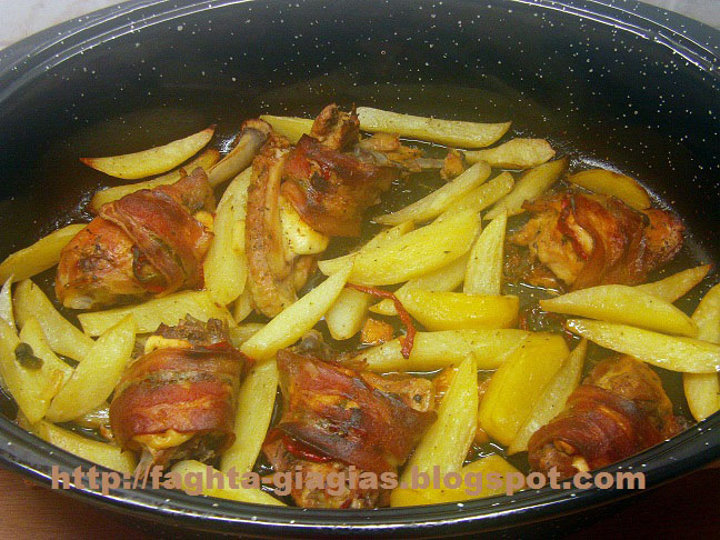 | Παίρνουμε ένα - ένα τα κομμάτια του κοτόπουλου και στο κάθε κομμάτι βάζουμε, μια ροδέλα απ᾿ την κάθε πιπεριά, μια φέτα σκόρδο, ένα κομμάτι γραβιέρα, τα τυλίγουμε προσεκτικά, με μια φέτα μπέικον και τα τοποθετούμε στη γάστρα. Καθαρίζουμε, πλένουμε και κόβουμε τις πατάτες, τους ρίχνουμε το υπόλοιπο λάδι, αλάτι, πιπέρι, τη ρίγανη και ό,τι άλλο υλικό μας έχει περισσέψει, τις ανακατεύουμε καλά και τις τοποθετούμε στη γάστρα, ανάμεσα στο κοτόπουλο. | |